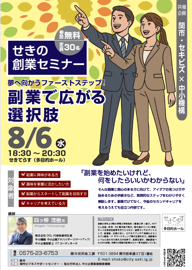 8月6日(水)18時30分より関市でせきの創業セミナー「副業で広がる選択肢」セミナー開催します。