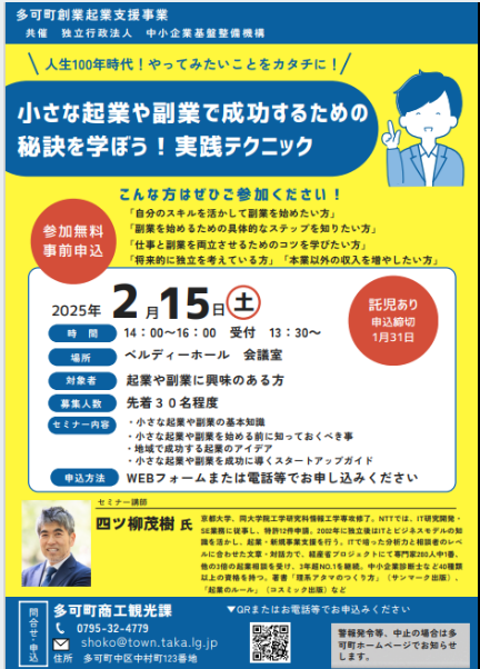 【創業セミナー】小さな起業や副業で成功するための秘訣を学ぼう!実践テクニック | 兵庫県多可町ホームページ