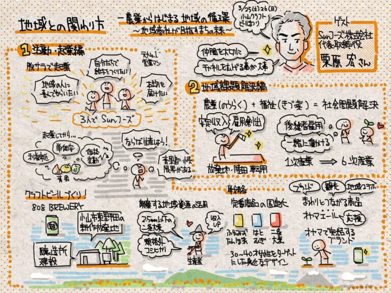 今回のグラレコは地域とのかかわり方シリーズから、Sunフーズ株式会社の代表取締役の栗原さんのお話を描かせていただきました。仲間を大切にするという栗原さんはとても素敵な方で、社会課題のために様々な取り組みをされていました。地域で廃棄されていた規格外品を使ったクラフトビールづくりや、放棄された田畑と福祉を組み合わせたを活用して6次産業化への取り組みなど、掛け合わせることで社会課題の実現を目指しておりました。
