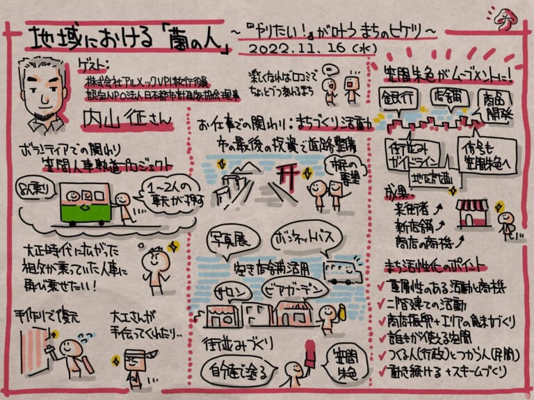 今回のグラレコは地域における菌の人シリーズから、内山征さんのお話を描かせていただきました。
