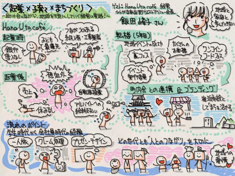 今回はHanaUtaCafeを経営されている飯田峰子さんのお話をグラレコさせていただきました。起業時にはリスクを減らすために銀行からの借り入れをせずに、つながりのある業者と一緒に始めたのですが、当初はとにかく想定通りにいかないことの連続だったそうです。地域イベントの成功を転機に地域との連携が広がっていくベースには学生時代からの経験の積み重ねや多世代とのつながりを大切にしてきたからこそ今へつながっているとのことでした。