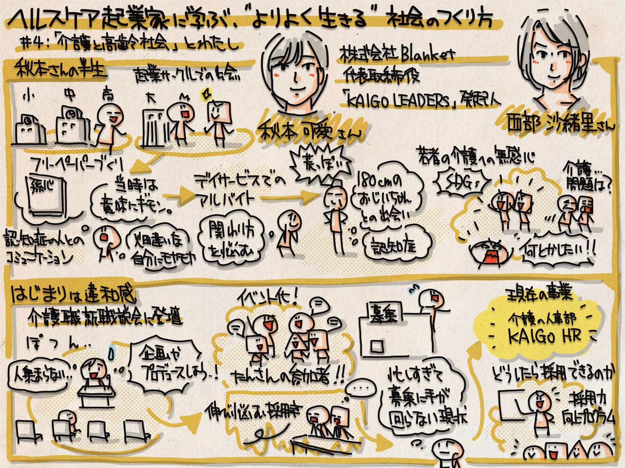今回は”よりよく生きる”社会の作り方シリーズをグラレコさせていただきました。ゲストはKAIGO LEADERS発起人の秋本可愛さん。もともとは介護に関して興味がなかったそうなのですが、学生時代に感じた小さな違和感から関心を持ち、最初は介護に関心がある仲間との飲み会という小さな一歩から少しずつ活動の幅を広げ、現在に至っているとの事です。小さな課題をコツコツと解決していった話を聞くと、自身についても日々を大切にせねばという事に気づかされました。