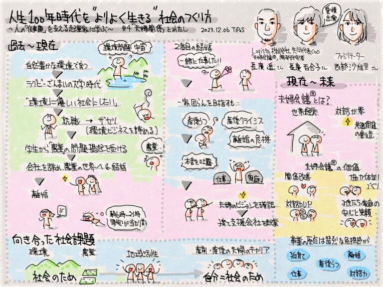今回のグラレコは人生100年時代を「よりよく生きる」社会の作り方から、夫婦関係にスポットを当てたお話を描かせていただきました。パートナーとの危機を乗り越えてきた長廣さんご夫妻が考案された夫婦会議®では、夫婦との対話や共通の価値観を持つこと。そして世帯経営の視点を持つことが大事であると言うことでした。夫婦会議®を通じて、夫婦の関係改善や対話力UP、子どもや過程の安心と笑顔などが実現できるそうで、私自身も参考にしたいと思いました。