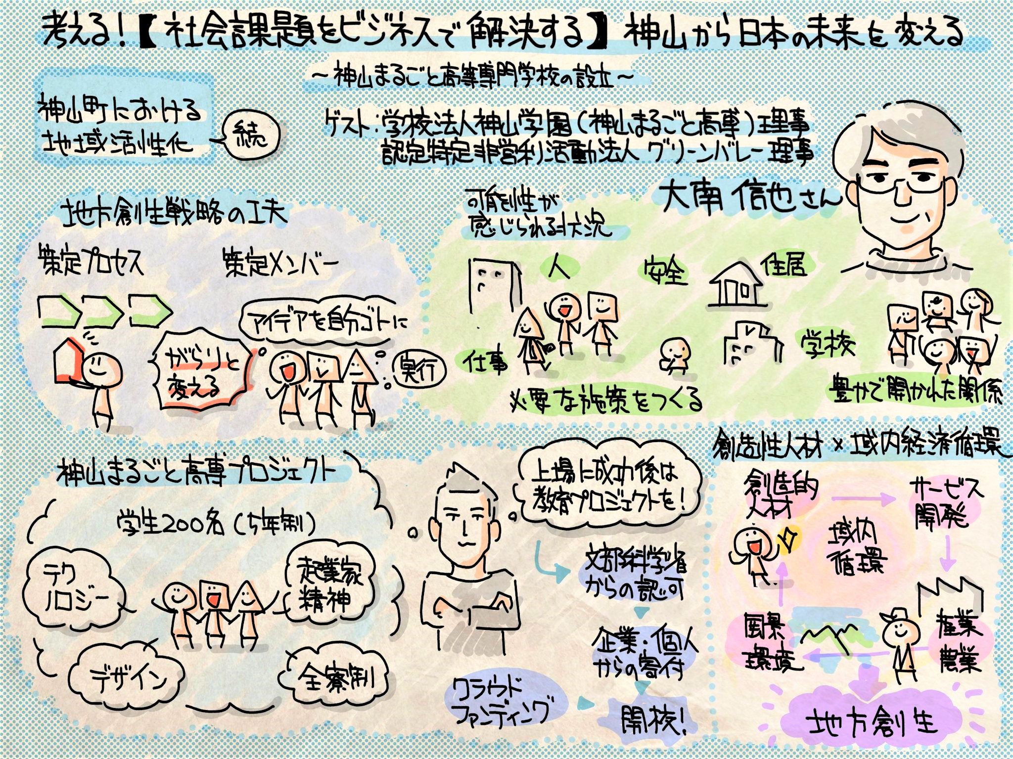 今回のグラレコは社会課題をビジネスで解決するシリーズから、神山まるごと高等専門学校を設立された大南さんのお話を描かせていただきました。2回シリーズの2回目となる今回は学校設立を中心としたお話でした。