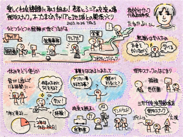本日は三世代交流型の「街中スナック」を通じて若者とシニアの交流の場を作られているたなかるいさんのお話を描かせていただきました。 様々な会社を転職されるキャリアを持たれているるいさんは、自分がやりたい事につながるような学びができる仕事を選んで転職されたそうで、時間の使い方や起業のポイントなど参加者が知りたい話をされていました。 またスナックを始める原点や、ビジネスとして成立するためのノウハウなど学びの多い時間でした。参加者から頂いた感想___________________