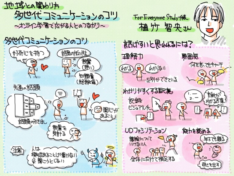 今回は地域との関わり方シリーズより、多世代コミュニケーションのコツというタイトルでFor Everyone Study(FES)代表である植竹さんからお話をいただきました。学生時代の原体験から様々な活動の中から得られた気づきや要望を現在の活動に繋げられていたのは印象深かったです。様々なお話があった中から、発信としてのコミュニケーション方法、受信として話しやすいと思われる方法をピックアップして描きました。私自身ヒントになることがたくさんありました。